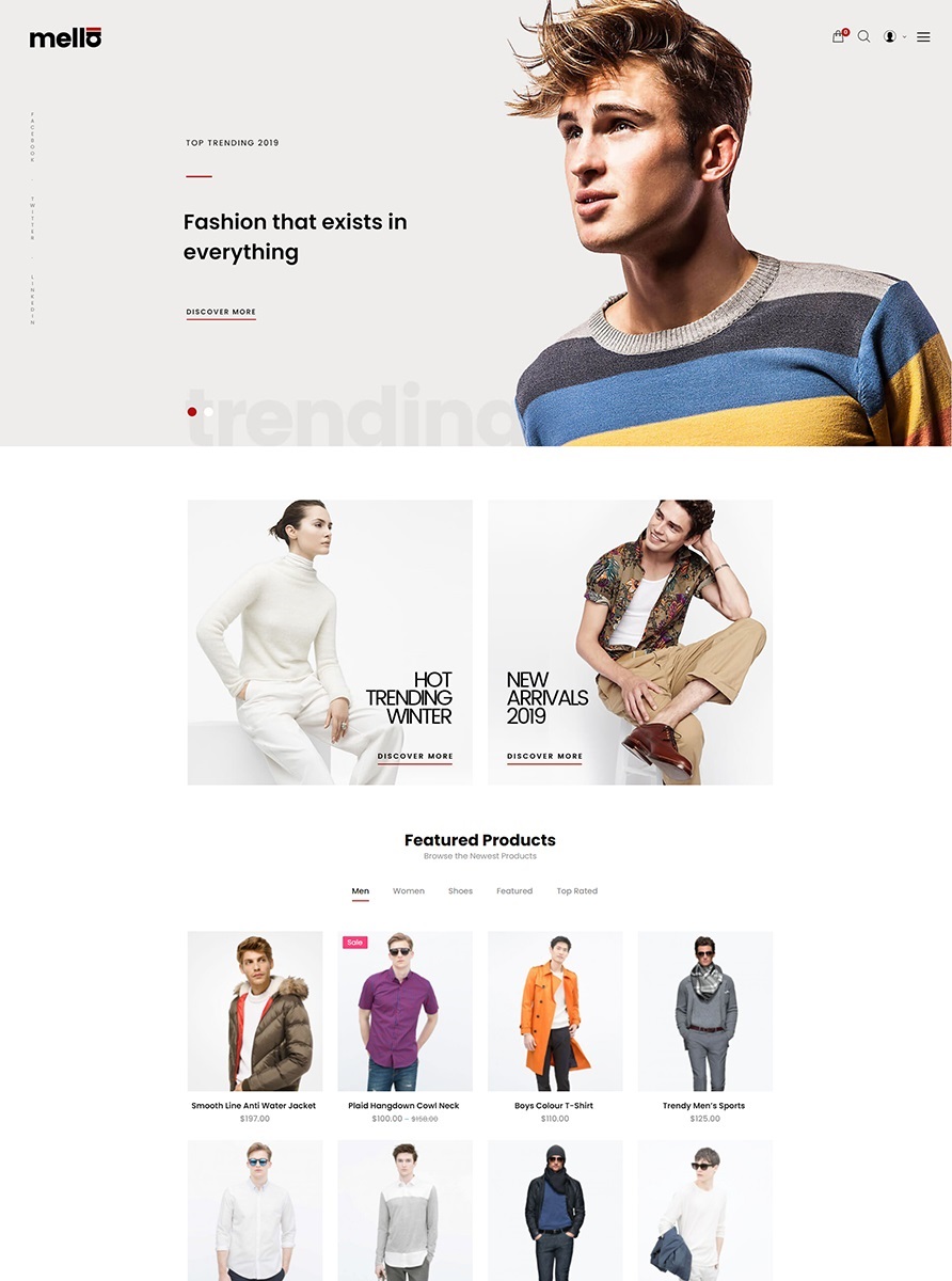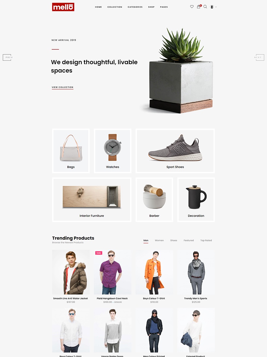 Mella layout is a modern and minimalist eCommerce Magento 2 theme with a proper attention to the details. It was built for your furniture store, clothing store, digital store, watch store, men store, women store, accessories store, cosmetics shop, bookstore, hi-tech store and etc.